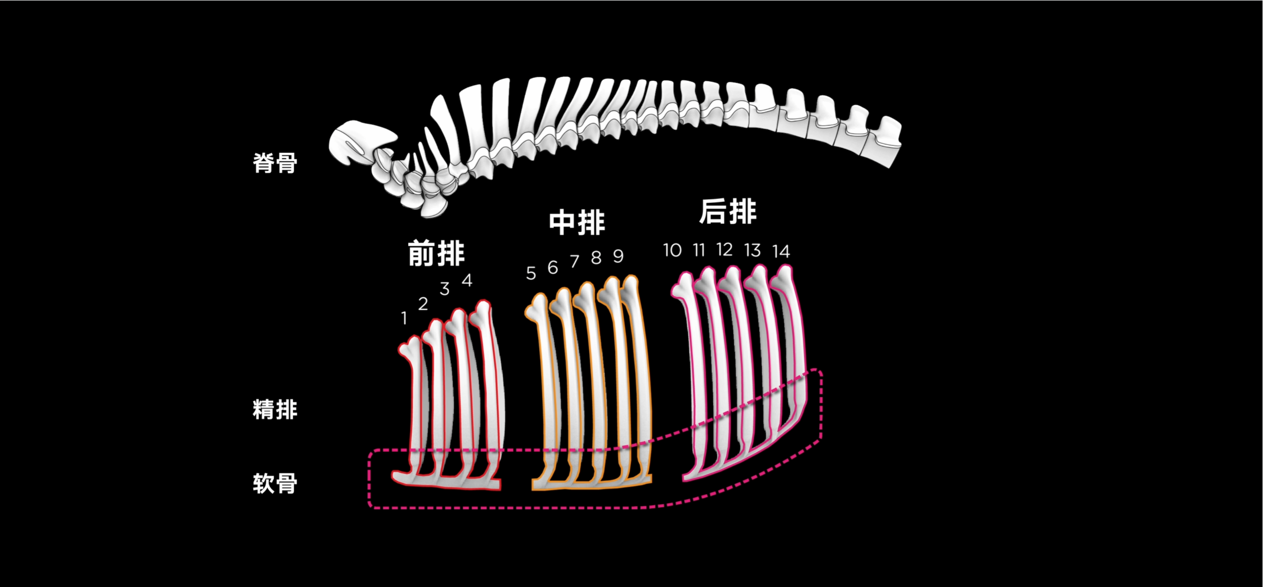排骨分前段、中段和后段。前段排骨不规整,因为靠近梅花肉,肉质肥瘦相间,风味是很不错的;中段排骨肋骨最长,是最贵也是最经典的排骨部位;后排的形状好,但是瘦肉比例高,口感偏柴。(软骨一半都是修下来单卖的)